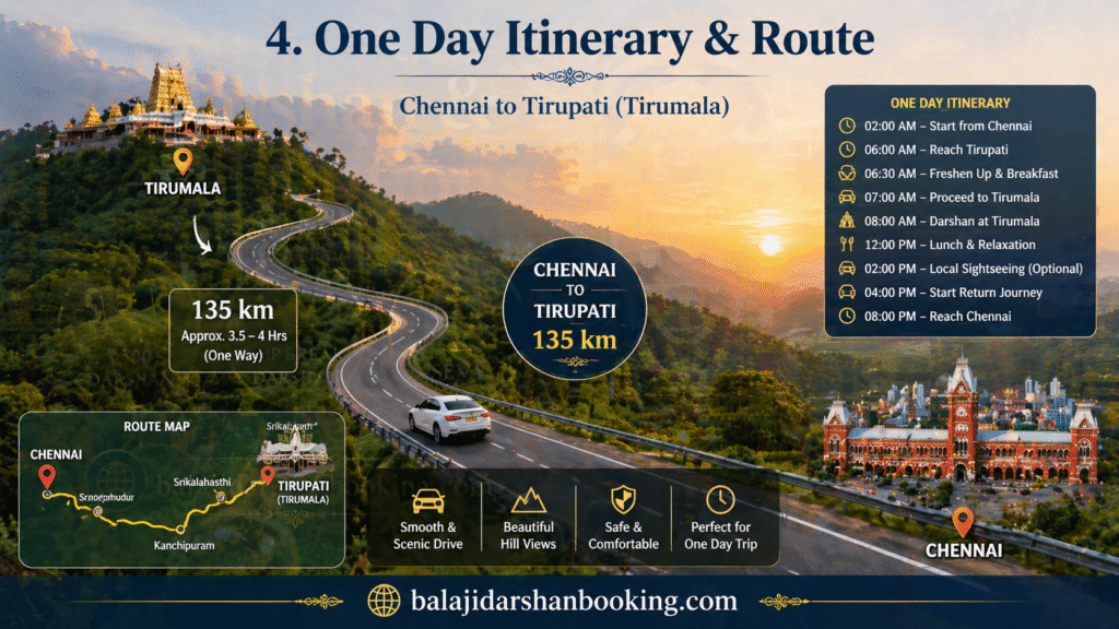 • Early morning departure improves chances of completing Tirupati darshan in one day from Chennai efficiently.