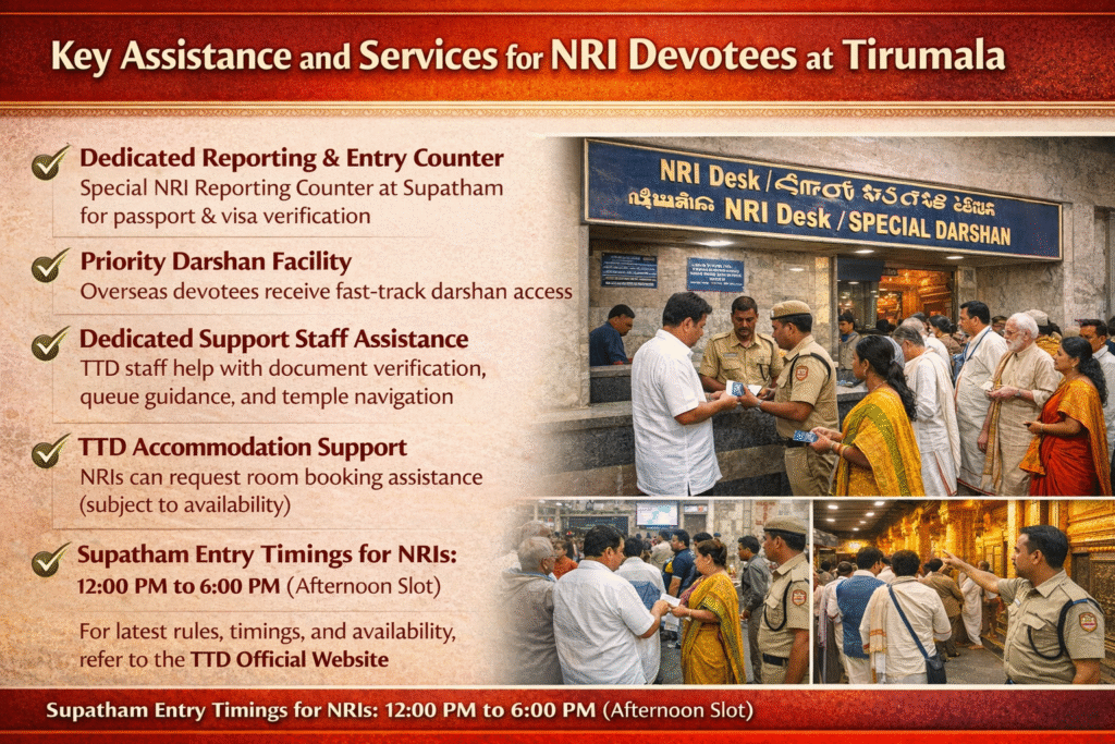 NRI devotees can also request TTD accommodation assistance at the help desk, depending on room availability and temple allotment rules.