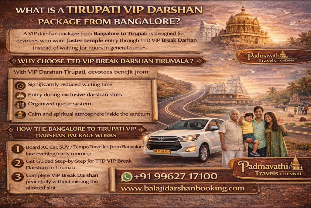 This detailed guide explains how to book Tirupati VIP darshan from Bangalore, the darshan process, eligibility, costs, travel options, and important tips.